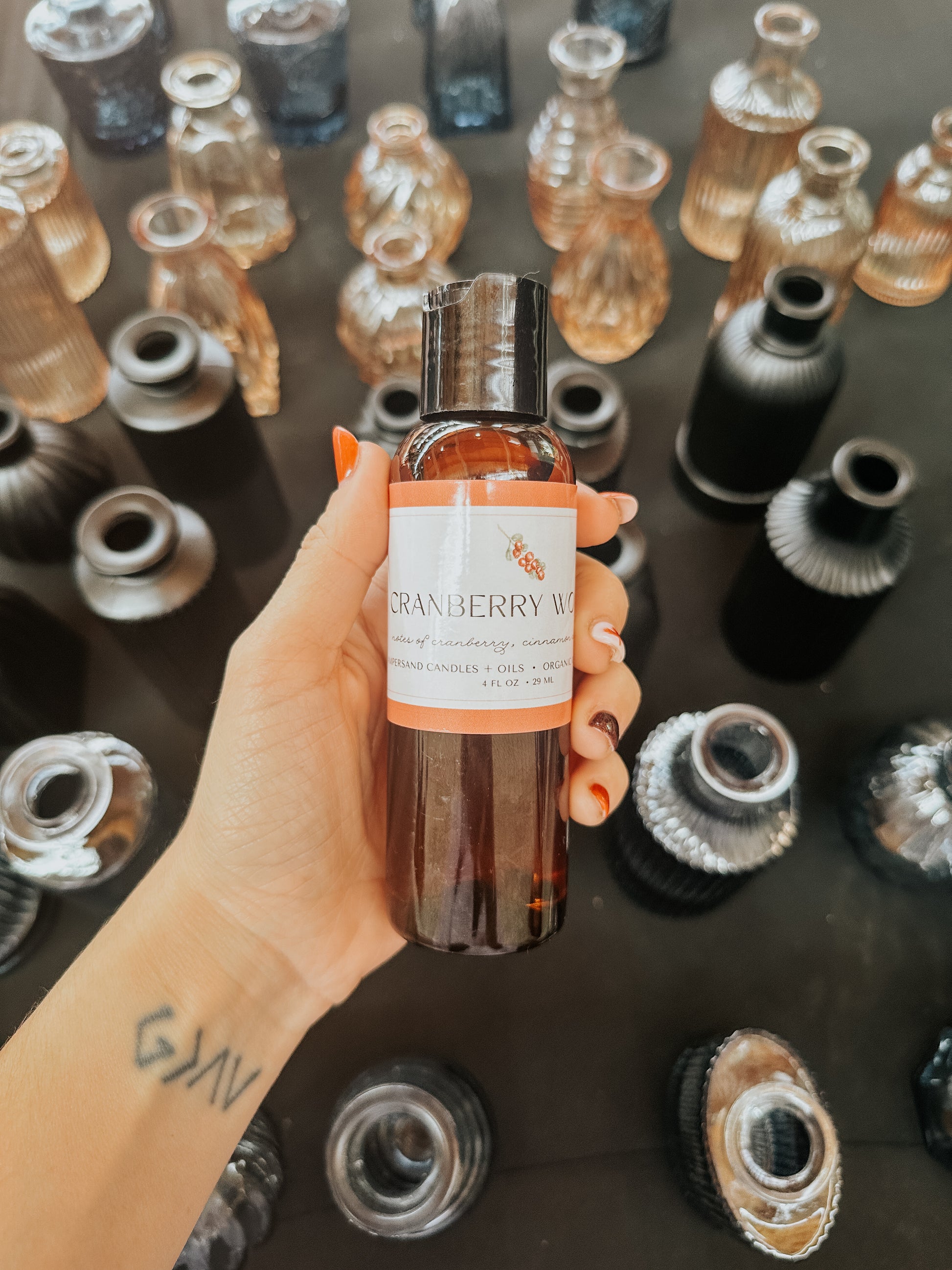 Safflower Carrier Oil, Cranberry Extract; Cinnamon Leaf, Vanilla Absolute, Fir Needle, and Pine Essential Oils.