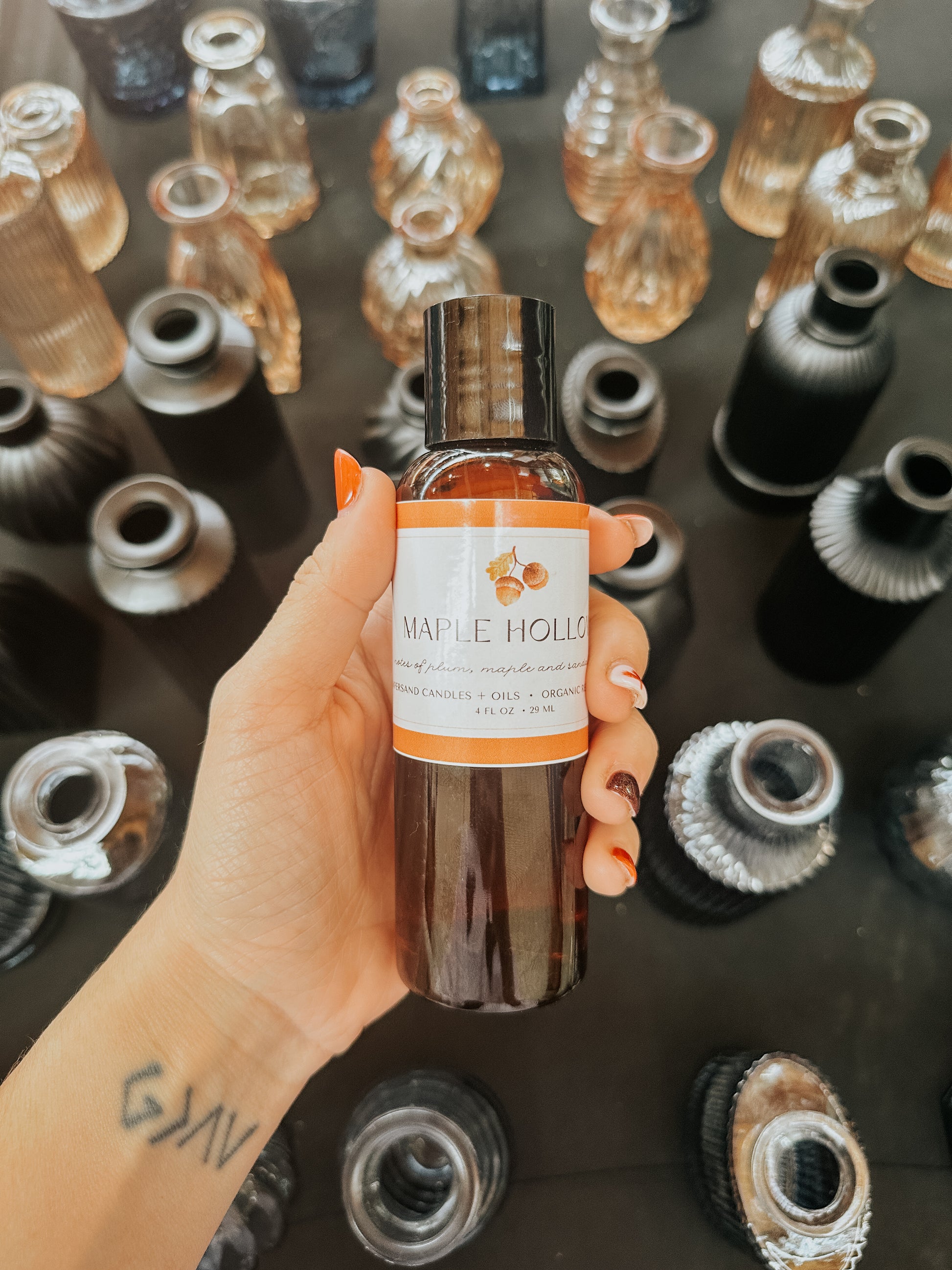 Safflower Carrier Oil, Plum Extract, Maple Extract; Patchouli and Sandalwood essential oils.